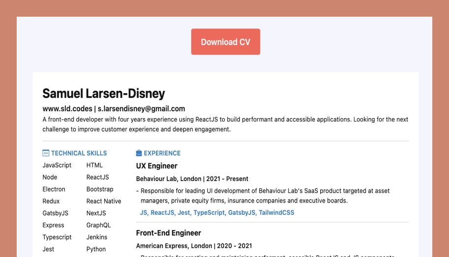 A few years ago, in an effort to "spice things up", I switched my CV from a PDF rendering on the page to a fully react-based document that exported to PDF on click. But the document was still static. The static nature of this document is ironic. A CV is rarely perfect for multiple roles; you might want to make it sound more technical or more design-focused with each application and as a result, it's constantly being tinkered with. So this month, I asked myself, what if my CV was a dynamic document?